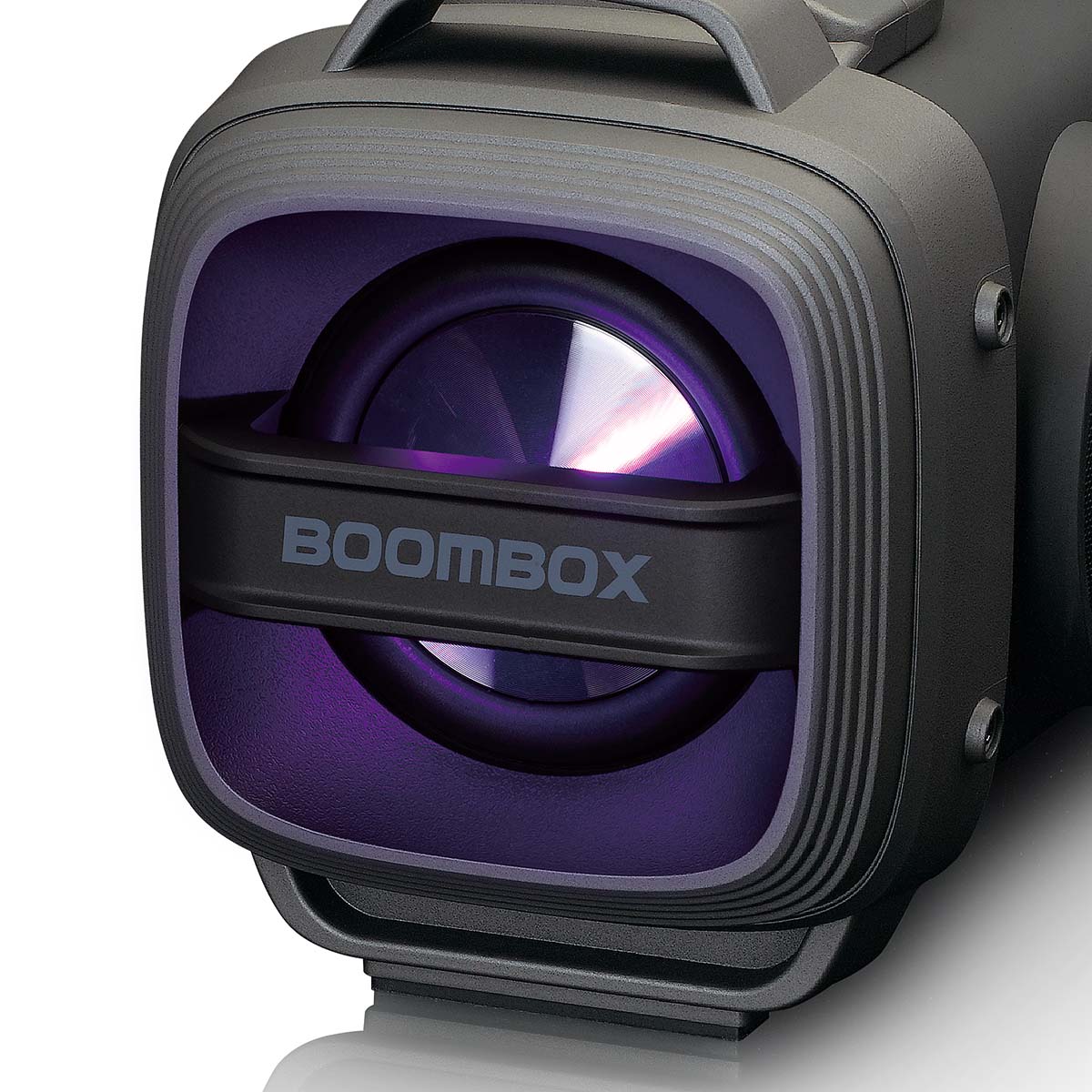 Die SPR-200BK ist perfekt für eine Party. Da diese tragbare Boombox über einen wiederaufladbaren Akku verfügt, können Sie sie problemlos überall hin mitnehmen. Zusätzlich gibt es eine Lichtanimation, die das Erlebnis abrundet.