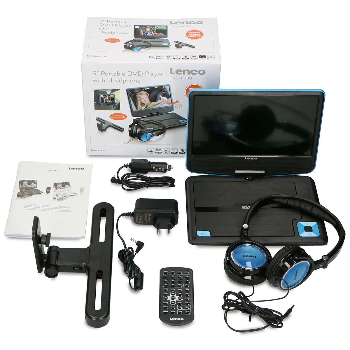 Der Lenco DVP-910 ist ein kompakter DVD-Spieler mit einem 9-Zoll-Bildschirm, welcher um 180° gedreht und gekippt werden kann. Er wird mit Fernbedienung, Kopfhörer, Kopfstützenbefestigung, 12 Volt Adapter und passendem Netzkabel ausgeliefert. Seine Auflösung von 800 x 480 Pixel sorgt für eine ausgezeichnete Bildqualität. Fahren Sie mit Ihrer Familie regelmäßig für ein paar Tage mit dem Auto oder dem Zug weg? Dann ist der Lenco DVP-910 der perfekte Reisebegleiter. Dank der einfachen Bedienung (Fernbedienung mitgeliefert) können sich die Kinder stundenlang ihre Lieblingsfilme ansehen oder Lieblingshörspiele per CD anhören, sodass die Reise wie im Flug vergeht. Zusätzlich wird Ihnen die Möglichkeit der Fortsetzungsfunktion geboten, d.h. Sie können den DVD-Spieler problemlos mitten im Film ausstellen und beim wieder einschalten dort weiterschauen, wo sie aufgehört haben. Über den USB-Eingang können Sie auch Ihre eigenen Videos und Fotos auf dem DVD-Spieler wiedergeben und gemeinsam mit der Familie anschauen. Der DVD-Spieler kann dank der mitgelieferten festen Halterung komfortabel an der Rückseite des Kopfstütze befestigt werden. Der Lenco DVP-910 unterstützt die Videoformat MPEG1, MPEG2 und MPEG4, das Audioformat MP3 und hat das Bildformat JPEG. Das Tonsignal können Sie durch die zwei eingebauten Lautsprecher oder die mitgelieferten Köpfhörer genießen. Der Lenco DVP-910 verfügt über eingebauten Lithium-Ionen-Akku (für ca. 2 Stunden Spielzeit), so dass Sie das Gerät auch ohne Kabel nutzen können. Es werden aber sowohl ein 12 Volt Adapter als auch ein Netzkabel mitgeliefert. Der Bildschirm wird gut gegen Kratzer geschützt, indem Sie den DVD-Spieler einfach zuklappen können, wenn Sie diesen nicht verwenden.Der Lenco DVP-910 ist in Blau/Schwarz und Rosa/Weiß erhältlich.