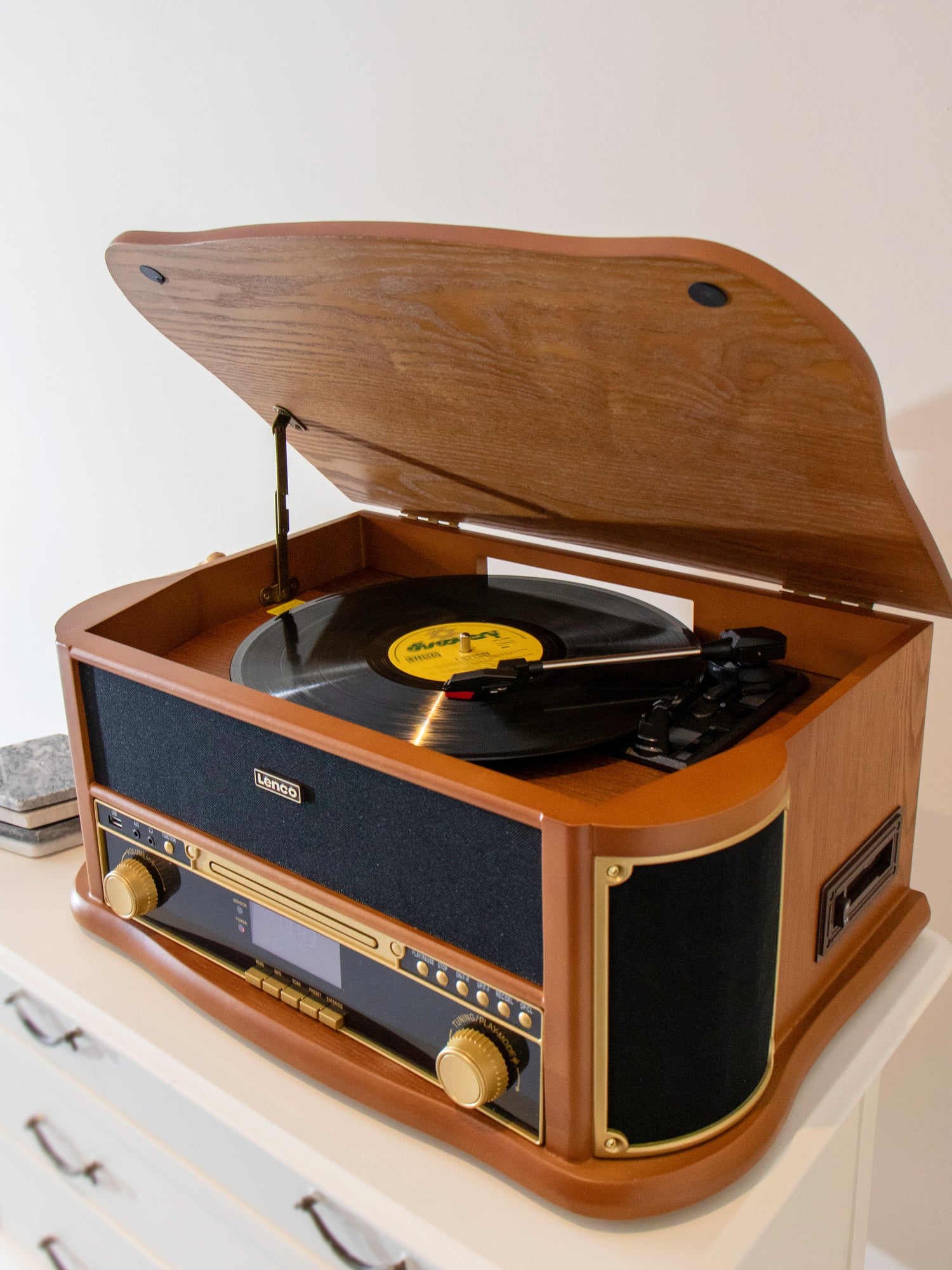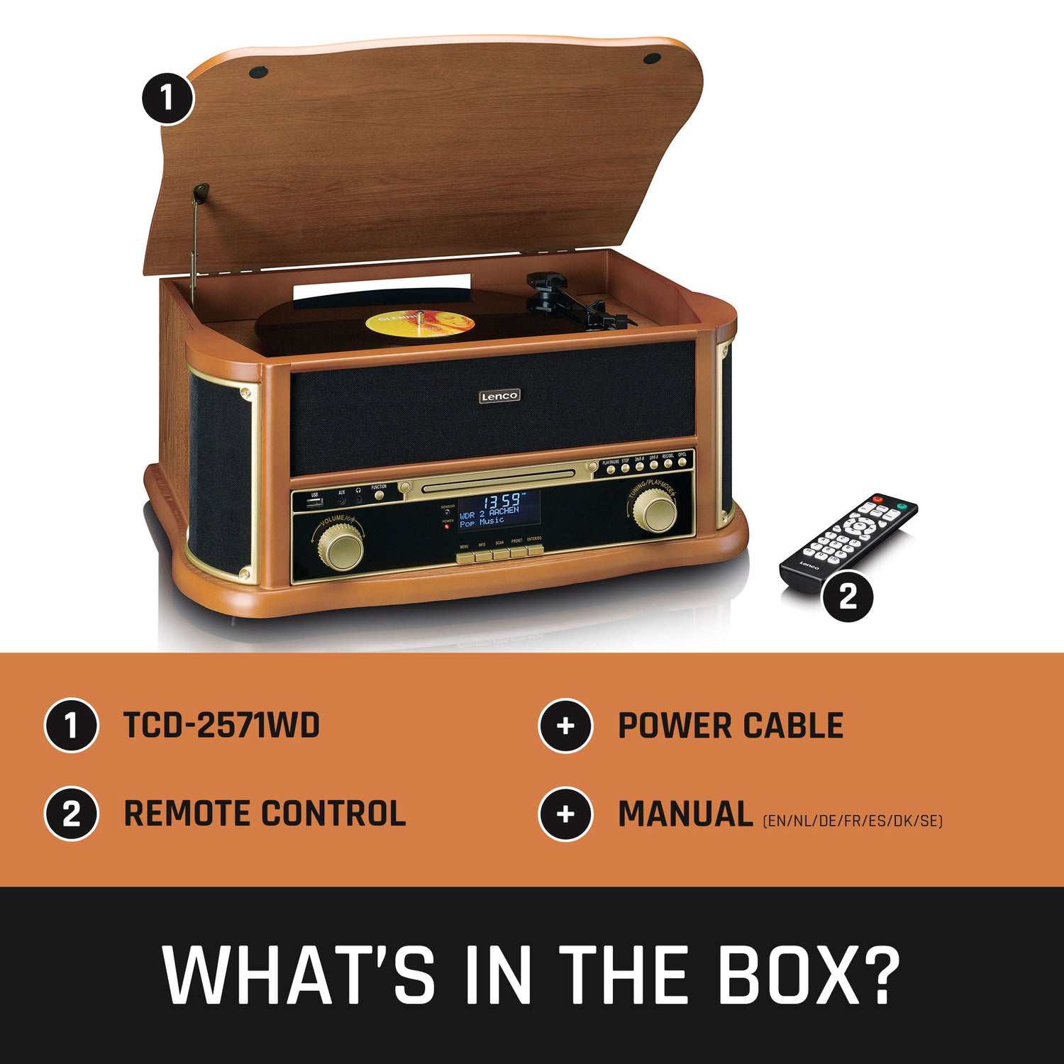 Der Classic Phono (by Lenco) TCD-2571WD ist ein multifunktionales All-in-One Musiksystem mit einem wunderschönen Retro-Design, das jedes Interieur bereichert. Der TCD-2571WD zeichnet sich durch den eingebauten Plattenspieler mit Riemenantrieb aus, bietet jedoch viel mehr als das. Der TCD-2571WD kombiniert mühelos klassische Funktionen mit modernen Wiedergabemöglichkeiten. Der hölzerne Retro-Plattenspieler verfügt unter anderem über Bluetooth®-Empfang, DAB+/FM-Radio, einen eingebauten CD-Player und einen Kassettenrekorder. Dies bietet ein vollständiges Hörerlebnis mit der perfekten Balance zwischen dem nostalgischen Charme der Vintage-Ästhetik und moderner Funktionalität. Der TCD-2571WD ist mit einem MDF-Gehäuse ausgestattet und wird mit einer Fernbedienung für zusätzlichen Komfort geliefert.