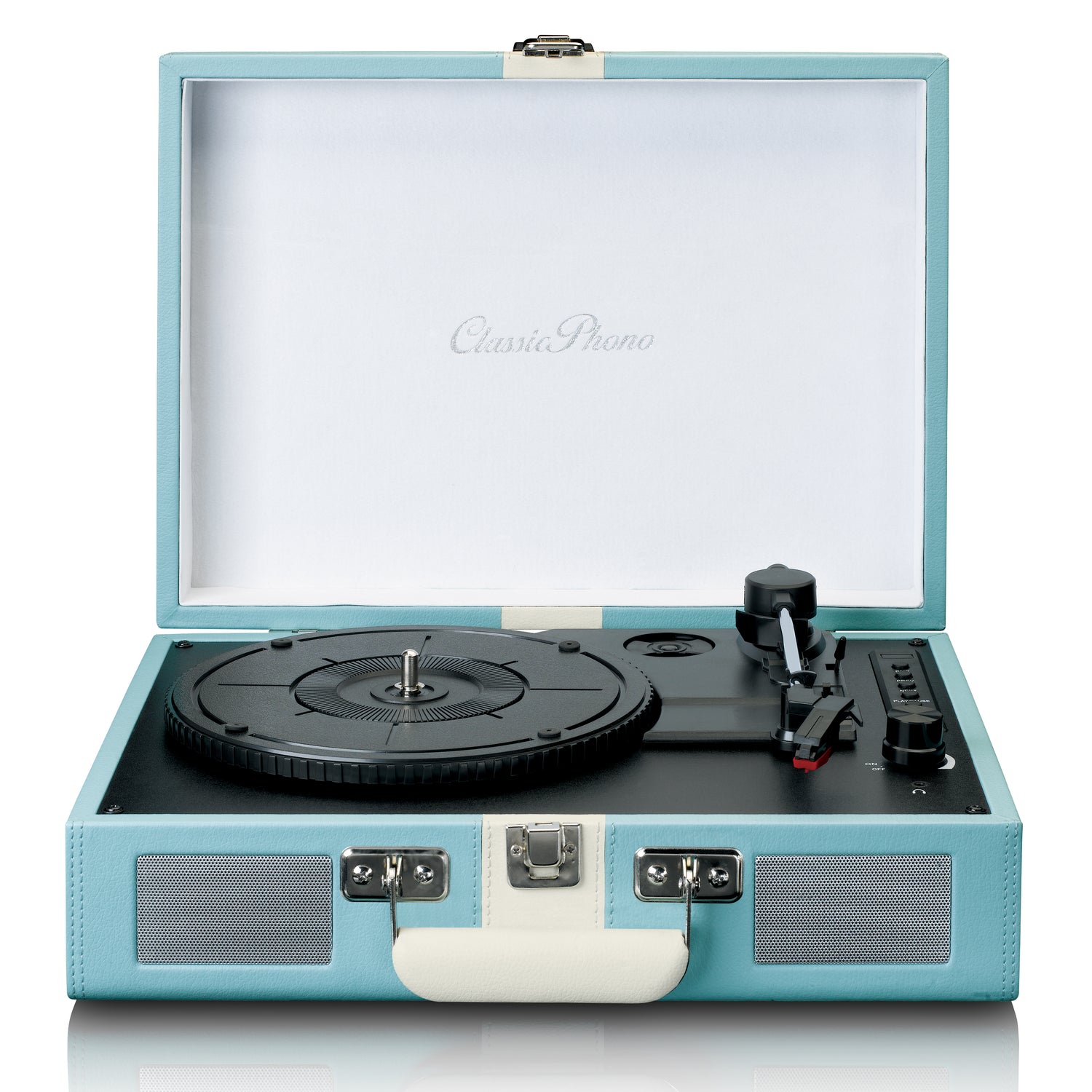 Classic Phono TT-110BUWH - Plattenspieler mit Bluetooth®-Empfang und integrierten Lautsprechern - Blau/Weiß - Euro / Typ-C (CEE 7/16)