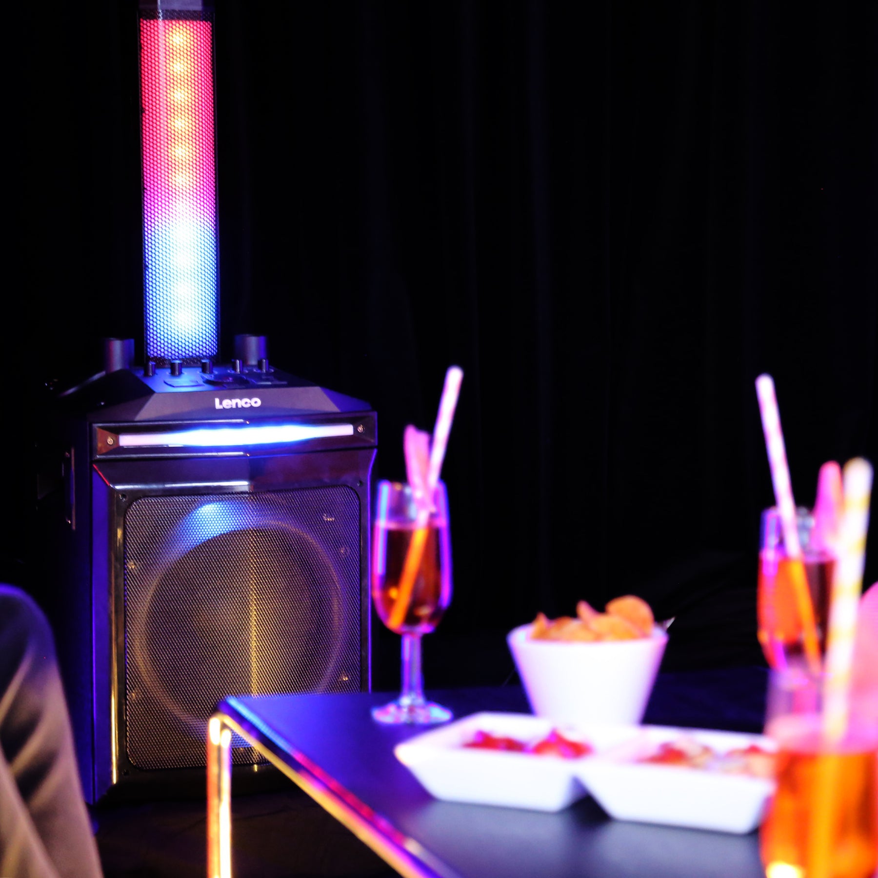 Der Lenco PA-220 ist ein Party-Lautsprecher mit Beleuchtung an der Vorderseite und an der zusätzlichen Säule, die auf den Lautsprecher gestellt werden kann. Der leistungsstarke Class-D-Verstärker mit X-Drive-Modus hat eine Ausgangsleistung von 120 Watt RMS. Bestehend aus 1 Horn, einem 2 Stück 3" Woofer und einem 10" Subwoofer. Verbinden Sie Ihr Smartphone oder Tablet über Bluetooth und spielen Sie die Musik direkt von Ihrer Lieblings-App ab.