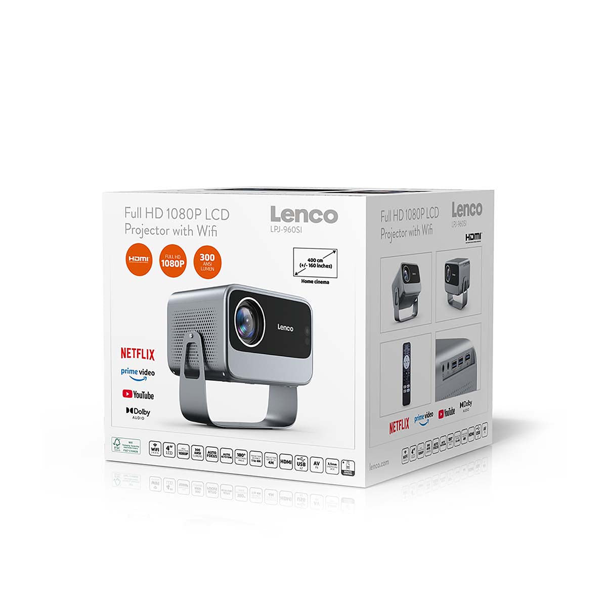 Mit dem Lenco LPJ-960SI Full HD LCD Beamer mit WLAN projizierst du Filme, Serien und Spiele in scharfer Qualität. Der Beamer ist kompakt und sofort einsatzbereit. Einschalten, mit dem 180° drehbaren Standfuß richtig ausrichten und die automatische Fokussierung sowie Trapezkorrektur erledigen den Rest. Dank integriertem WLAN schaust du Netflix, Prime Video und YouTube direkt ohne zusätzliche Geräte. Der integrierte 5-W-Stereo-Sound sorgt für klaren Klang bei jeder Nutzung.